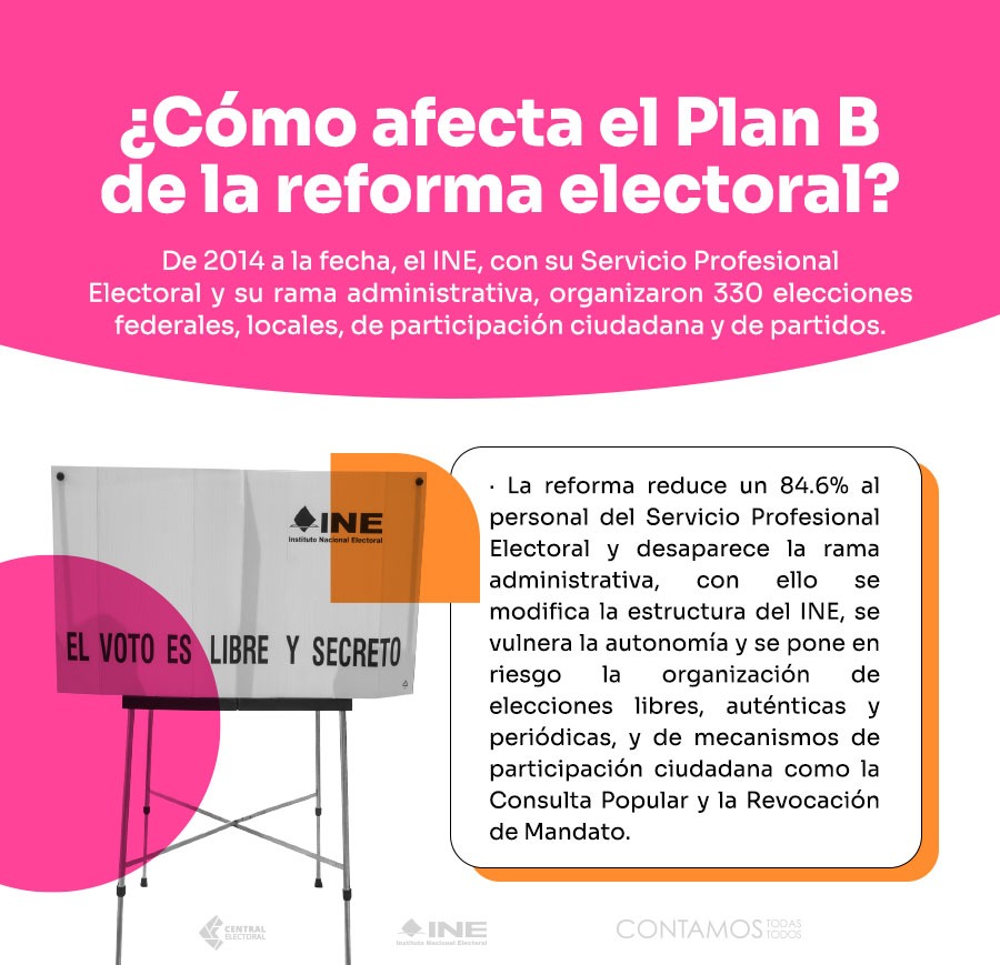 El llamado «Plan B» incluye reformas de leyes electorales con las que según el mandatario mexicano se pretenden ahorrar 3.500 millones de pesos (unos 175 millones de dólares), eliminar facultades para sancionar partidos y funcionarios, así como desaparecer el conteo rápido que se da inmediatamente después de una elección en México.