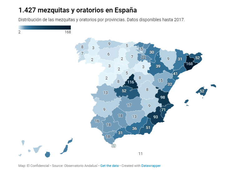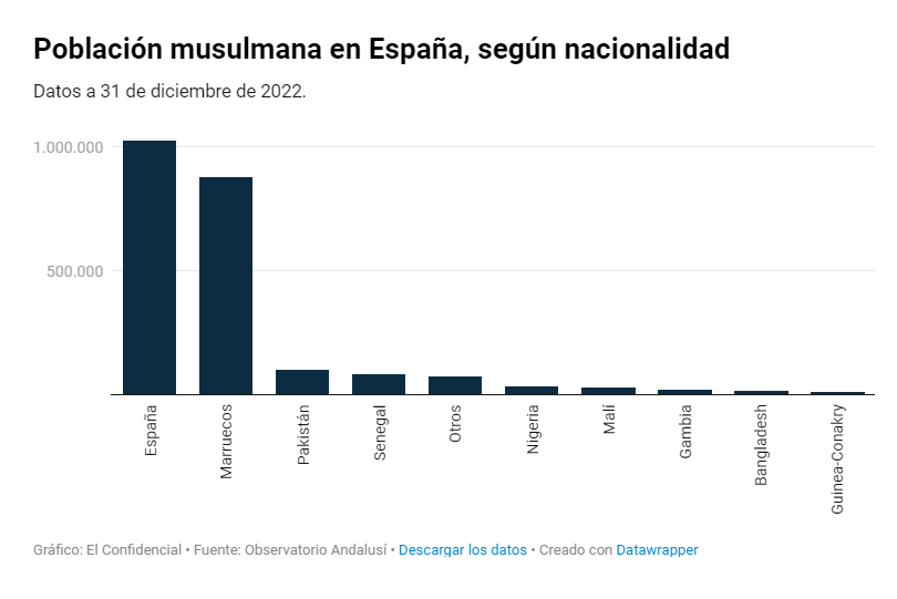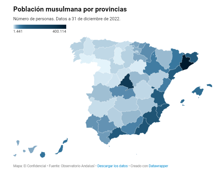 En España hay 2,34 millones de personas de tradición musulmana -no todos son practicantes- según el Observatorio Andalusí, un centro de estudios vinculado a la UCIDE, la principal federación islámica. Disponen de más de 1.500 oratorios y solo un puñado de auténticas mezquitas. La mayoría residen en Cataluña y en Andalucía. Representarían el 4,9% de la población, un porcentaje que algunos demógrafos consideran algo abultado, pero no ofrecen cifras alternativas.