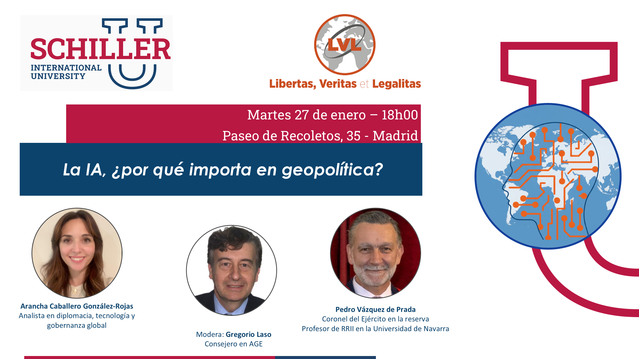 Schiller International University Paseo de Recoletos, 35, MadridColoquio: «La IA ¿por qué importa en geopolítica» - 27 de enero de 2026 El Foro LVL, en colaboración con la Schiller International University, organiza un coloquio para analizar los retos y oportunidades que plantea la inteligencia artificial en el equilibrio de poder global, con la participación de expertos en seguridad, relaciones internacionales y gobernanza...