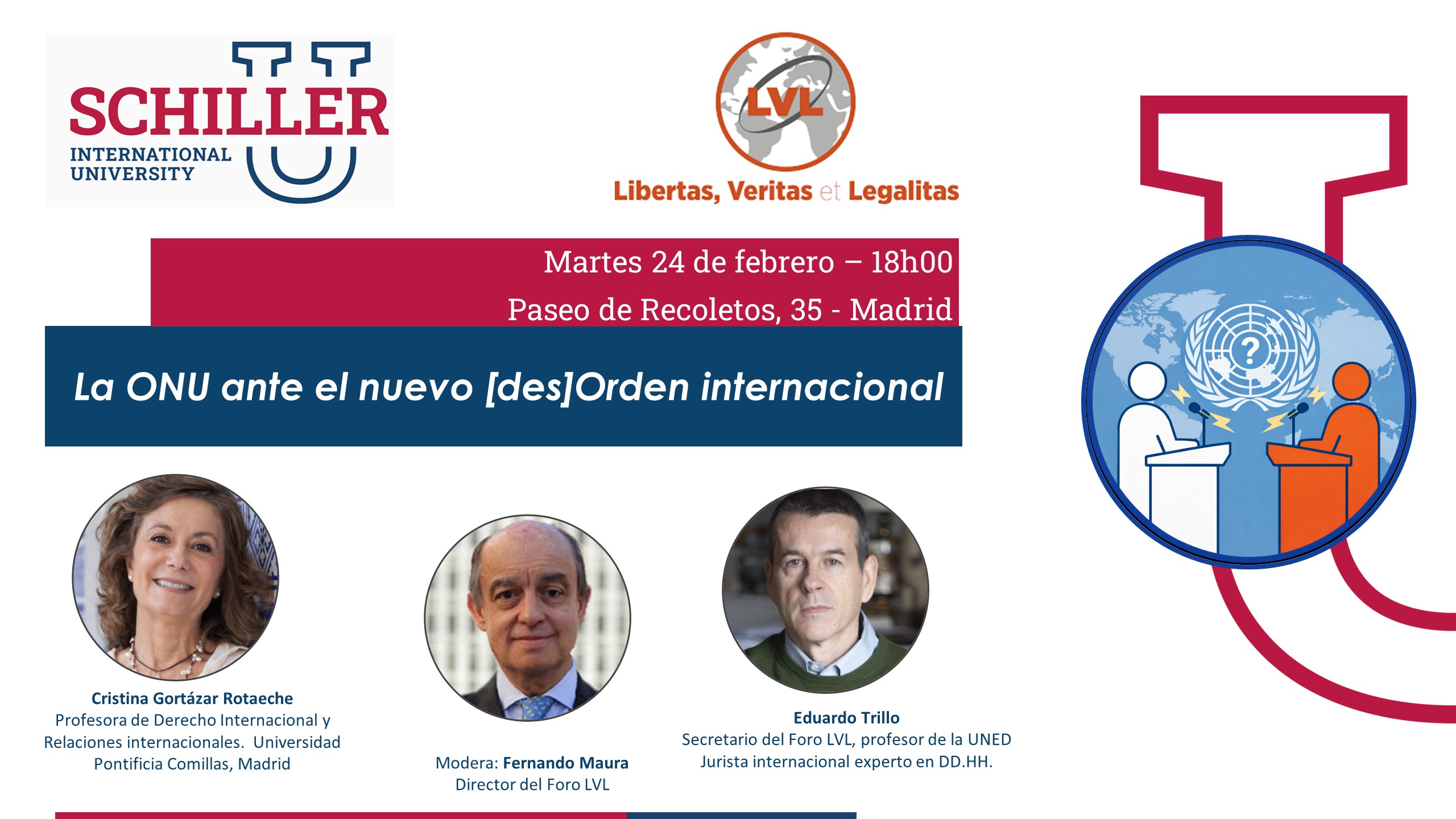 Schiller International University Paseo de Recoletos, 35, MadridColoquio: «La ONU ante el nuevo Orden internacional» - 24 de febrero de 2026 El Foro LVL, en colaboración con Schiller International University, organiza un coloquio para reflexionar sobre el papel de la ONU ante la creciente fragmentación del orden internacional y los desafíos que amenazan el sistema multilateral. En un contexto marcado por conflictos...